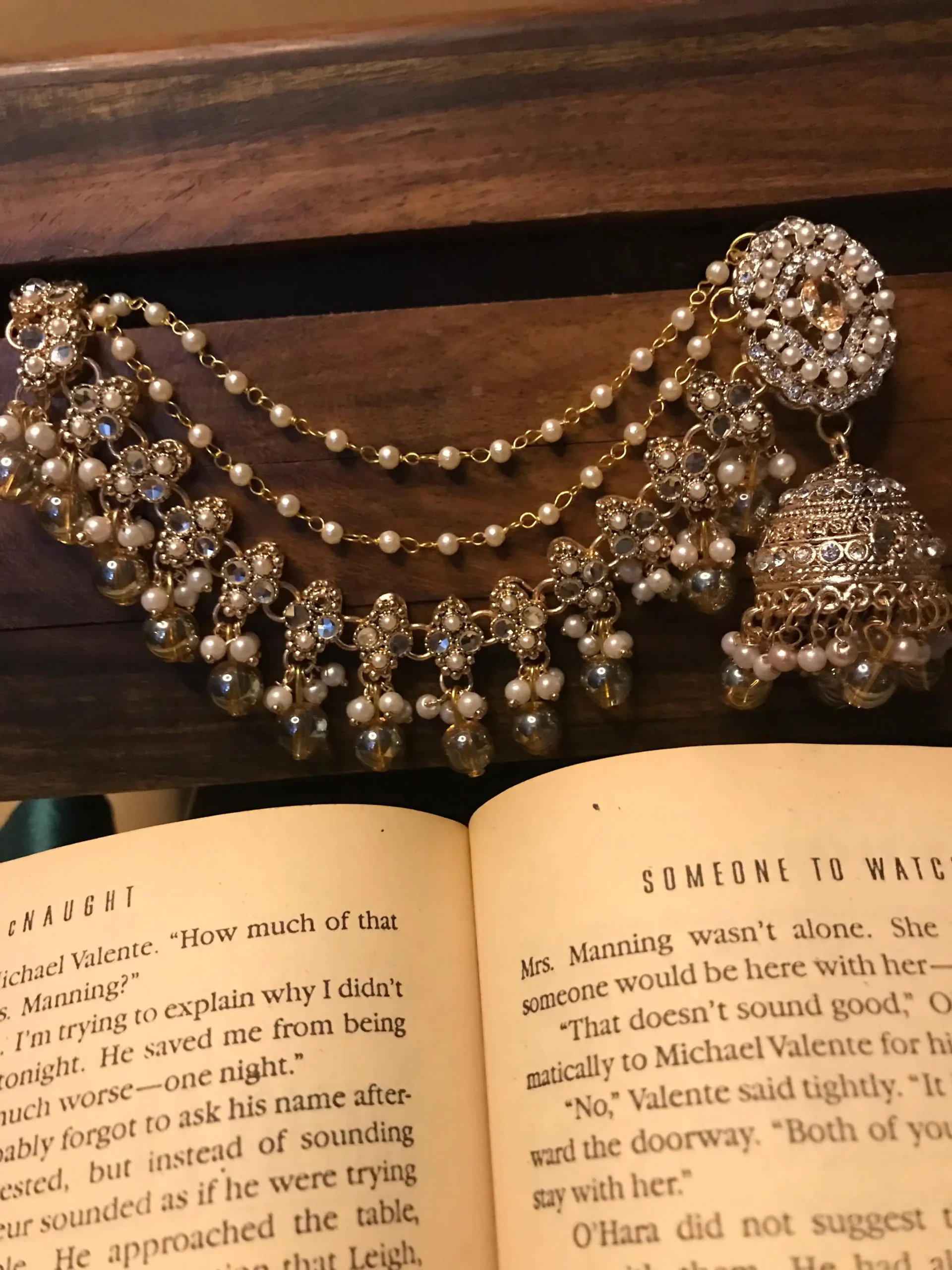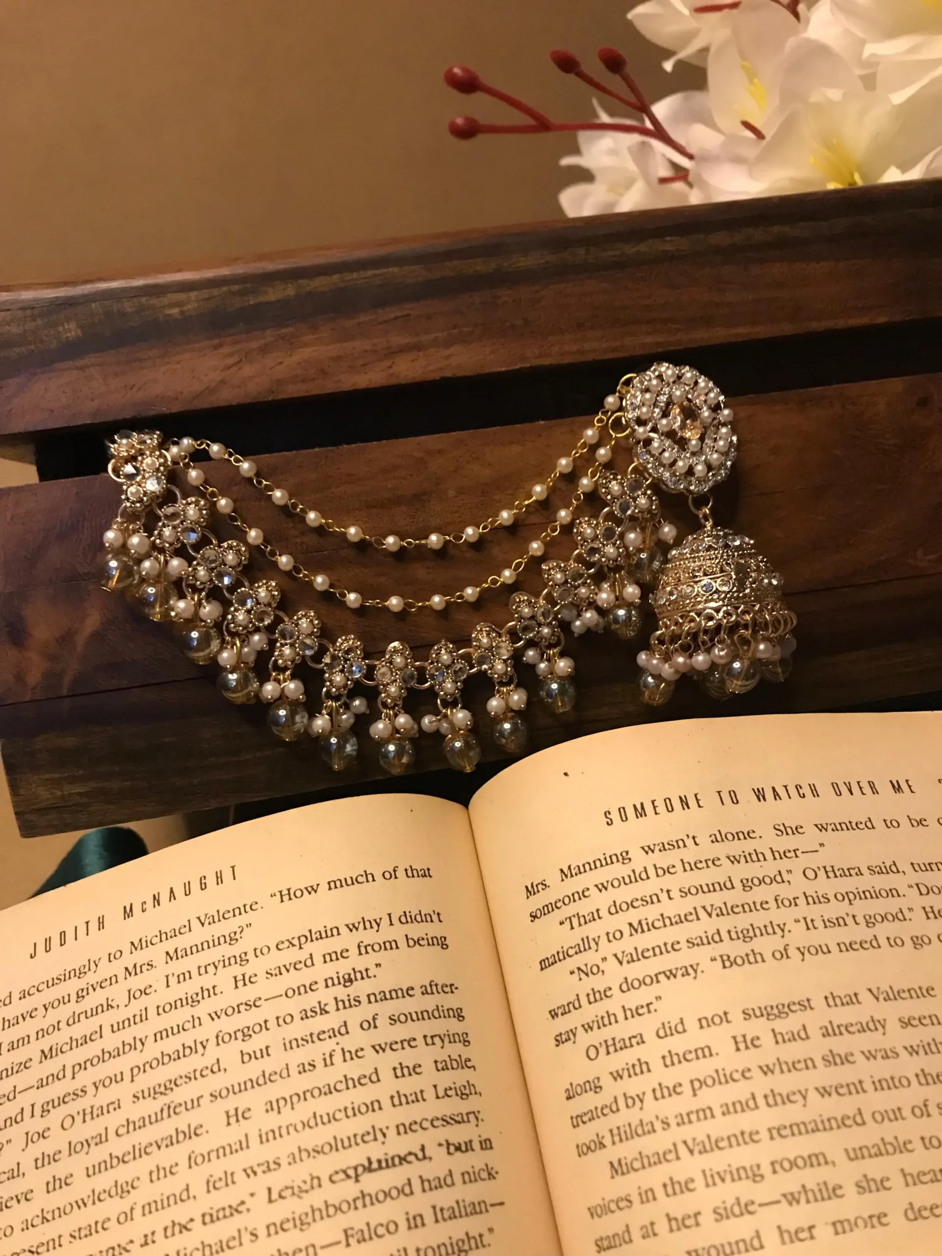 The lower Sahara band mirrors the motifs of the jhumka itself, adorned with repetitive floral Kundan clusters set in antique gold tones. Each cluster is finished with dangling ghungroo-style beads, evoking the richness of temple jewelry and classical Indian aesthetics. These elements add texture, movement, and a subtle sound, enhancing the sensory appeal of the piece.