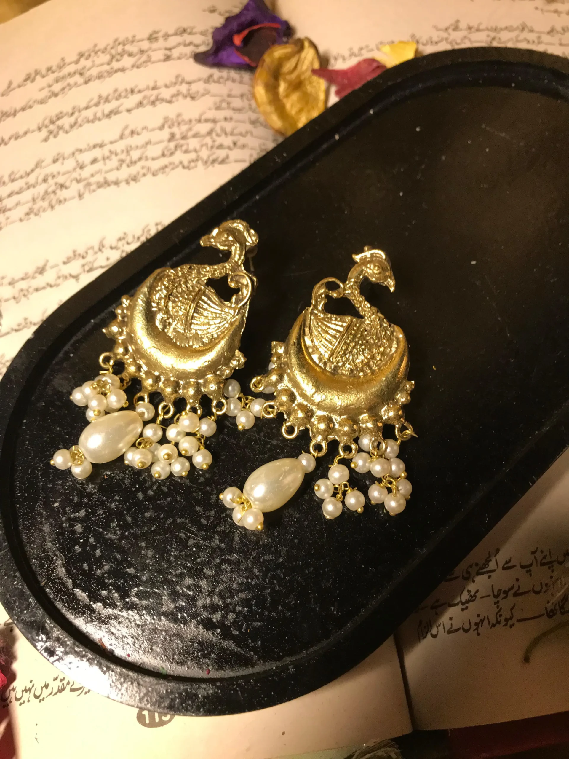 Seed Pearl Bunches: A series of small, ivory-toned pearls are delicately wired to the base of the golden peacock. These clusters add a “Jhumka-like” volume to the drop earrings, catching the light softly.