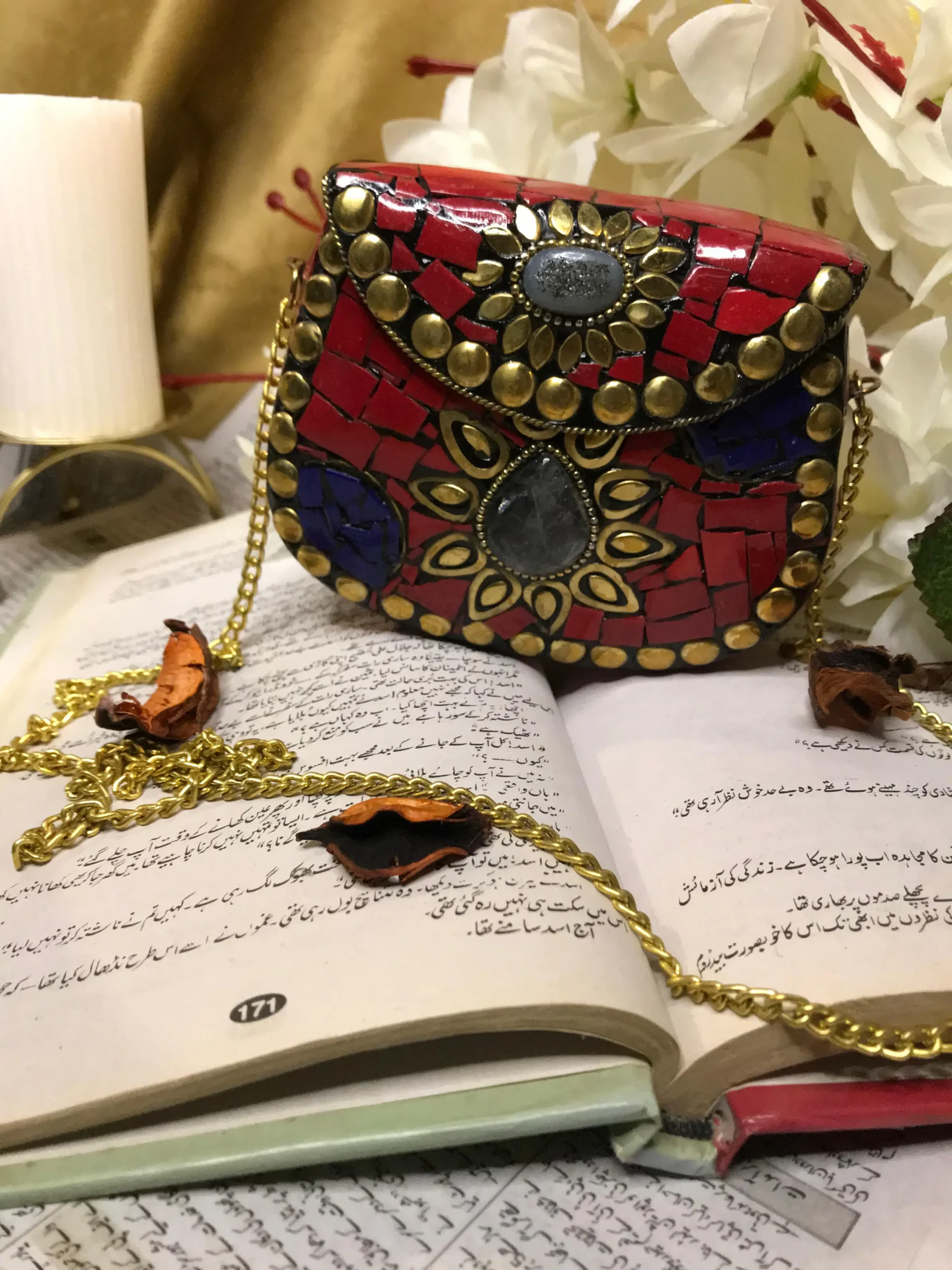Each Evening Clutch Bag showcases a unique design featuring ornate floral patterns that are delicately embellished with gold-toned metal studs. These decorative elements evoke the beauty of small suns or flowers, creating a rich tapestry of textures and colors that are sure to catch the eye. Not just beautiful, this bag is also practical – it comes with a detachable gold-colored chain strap that offers versatility in how you wear it. Opt for the chic over-the-shoulder style or carry it as a classic clutch to fit your personal preference.