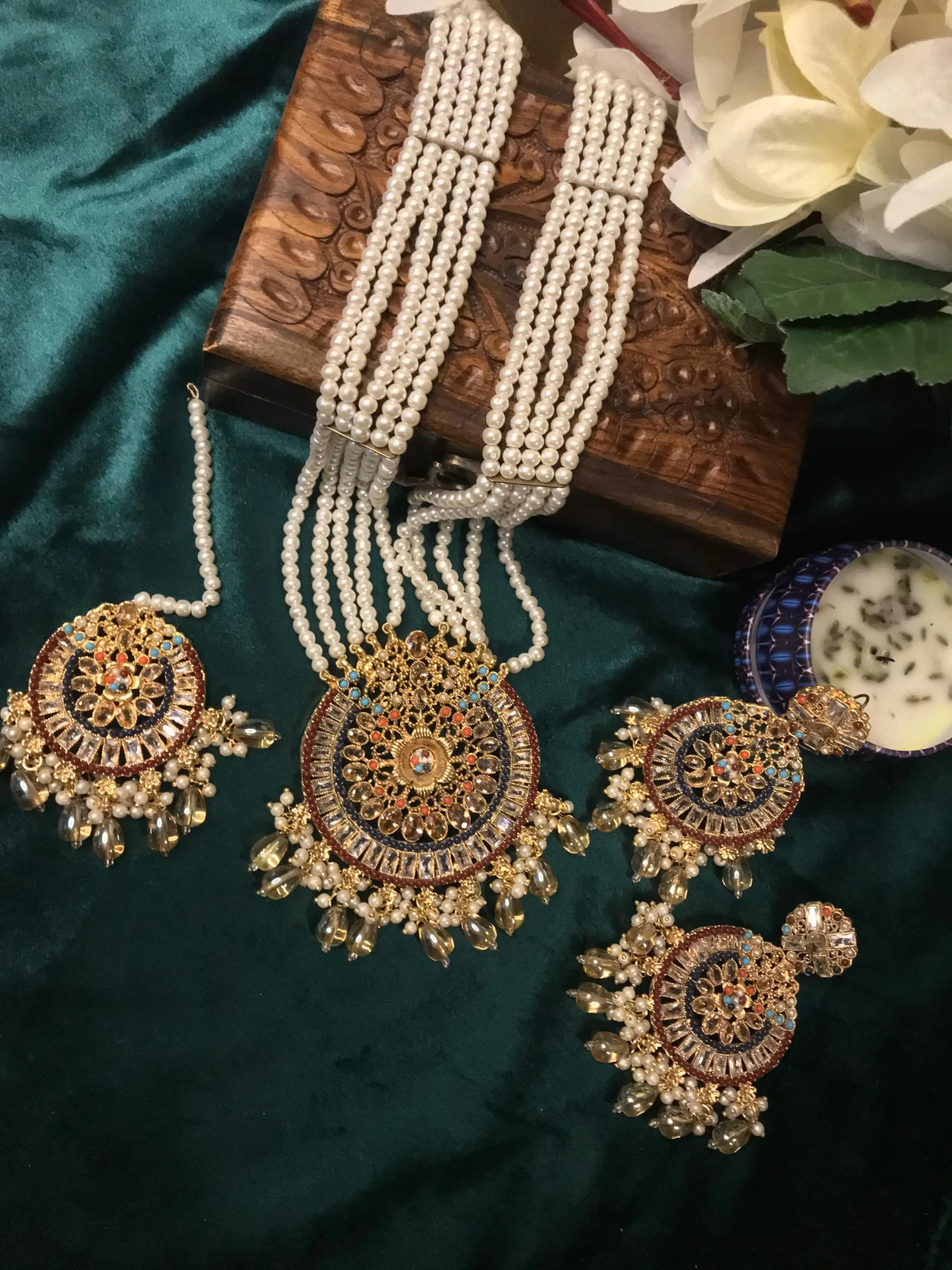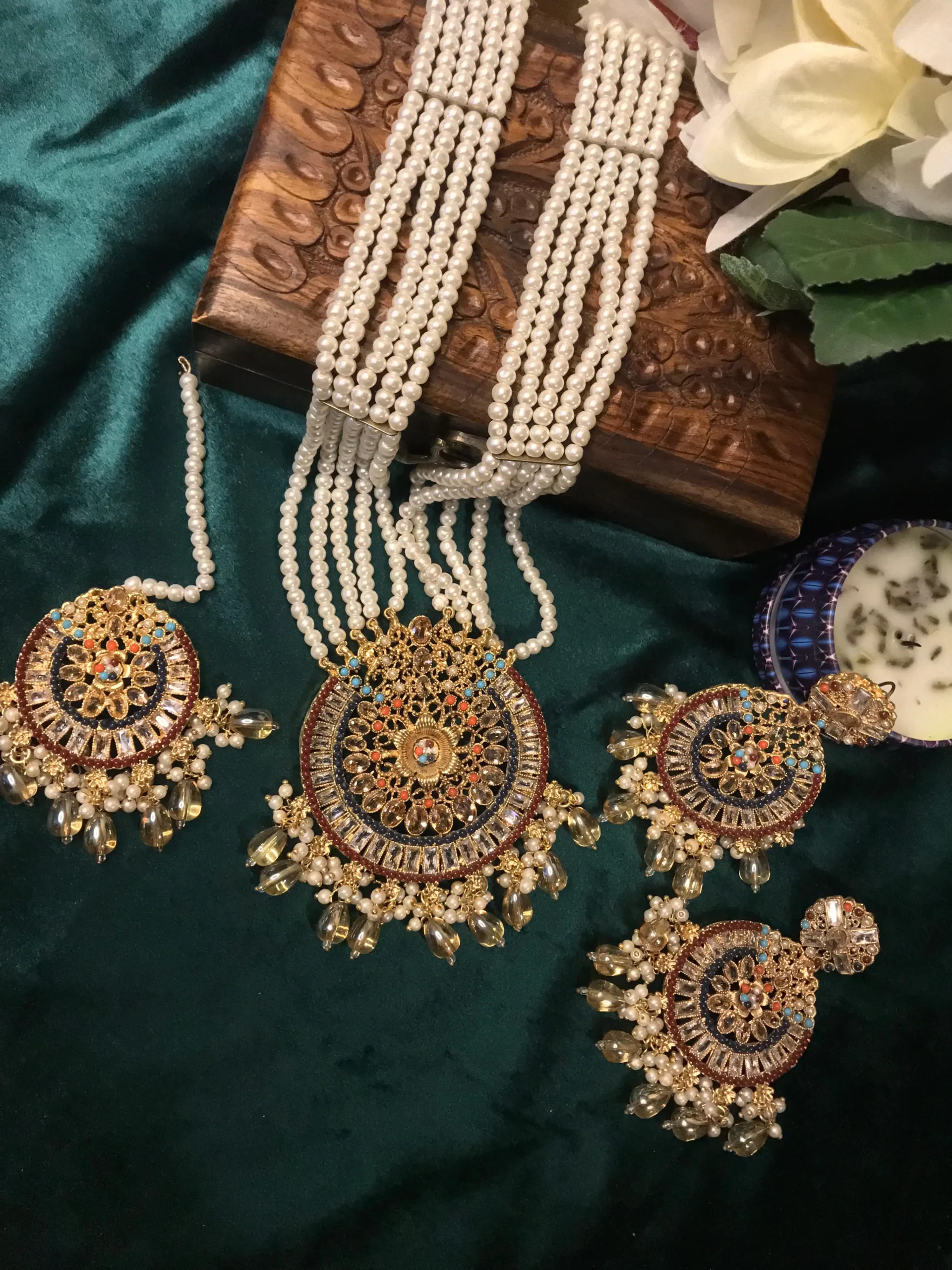 A timeless embodiment of Kundan jewelry, one of the most revered and sophisticated traditional art forms of Pakistan and the greater Asian subcontinent. With its roots tracing back to the royal ateliers of Rajasthan and Gujarat during the Mughal era, Kundan jewelry flourished under imperial patronage, where master craftsmen created opulent adornments exclusively for queens, princesses, and nobility. Over centuries, this regal tradition was lovingly preserved and refined, becoming an enduring symbol of luxury, heritage, and craftsmanship.