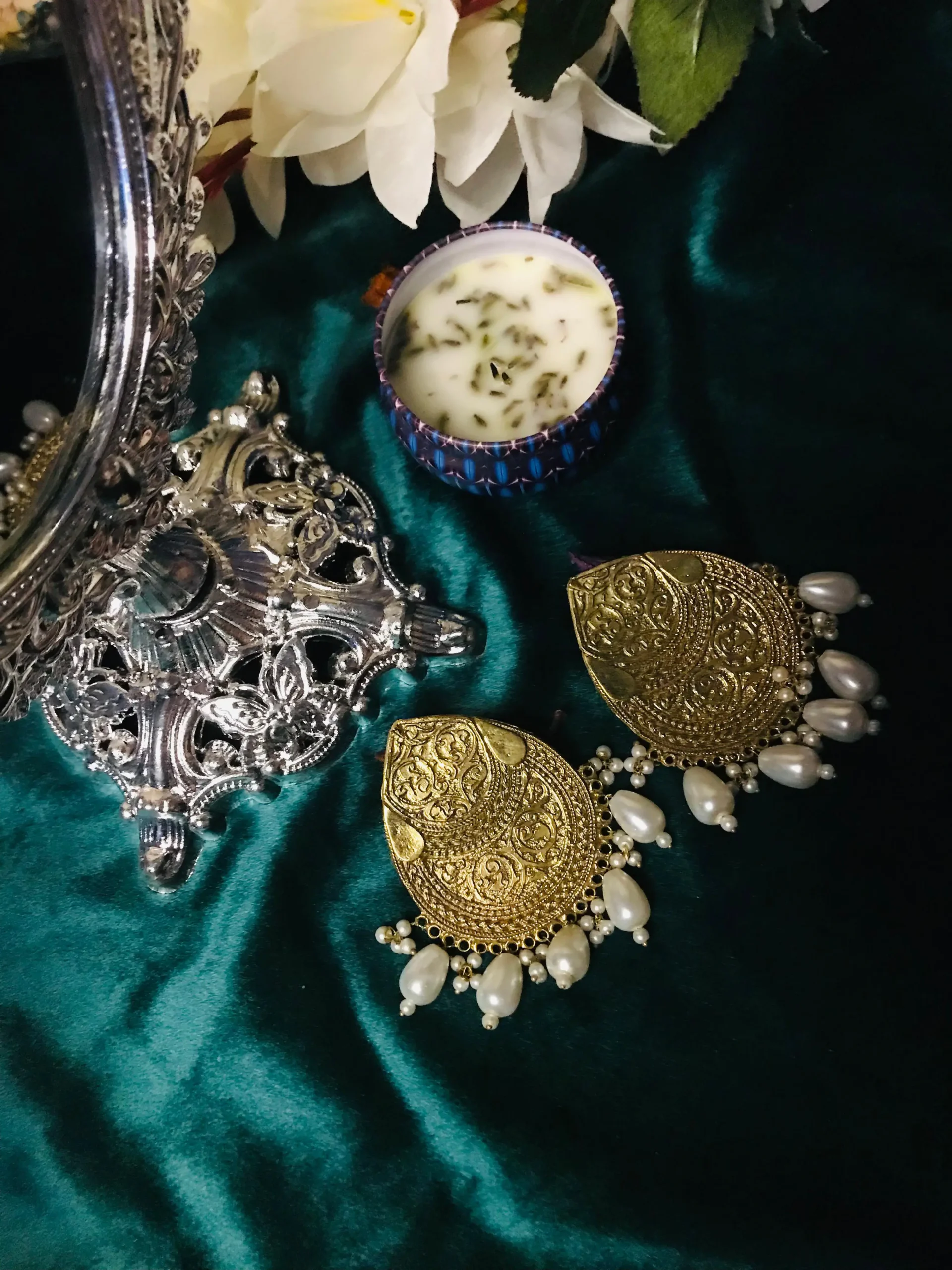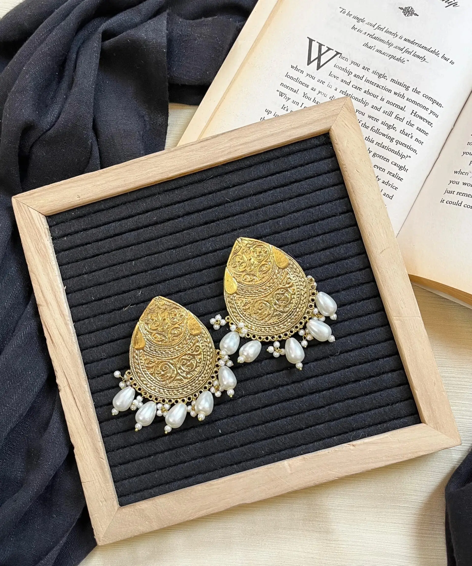 Our Antique Gold Earrings are more than accessories; they are masterpieces from the world of oxidized jewelry. Featuring a rich gold finish that catches the eye and holds its lustrous shine, these earrings redefine sophistication. Adorned with pearl drop-shaped white beads, each piece boasts intricate details that reflect traditional artistry. This seamless blend of modern style and vintage craftsmanship ensures that these earrings complement any ensemble, giving you an unparalleled edge in fashion.