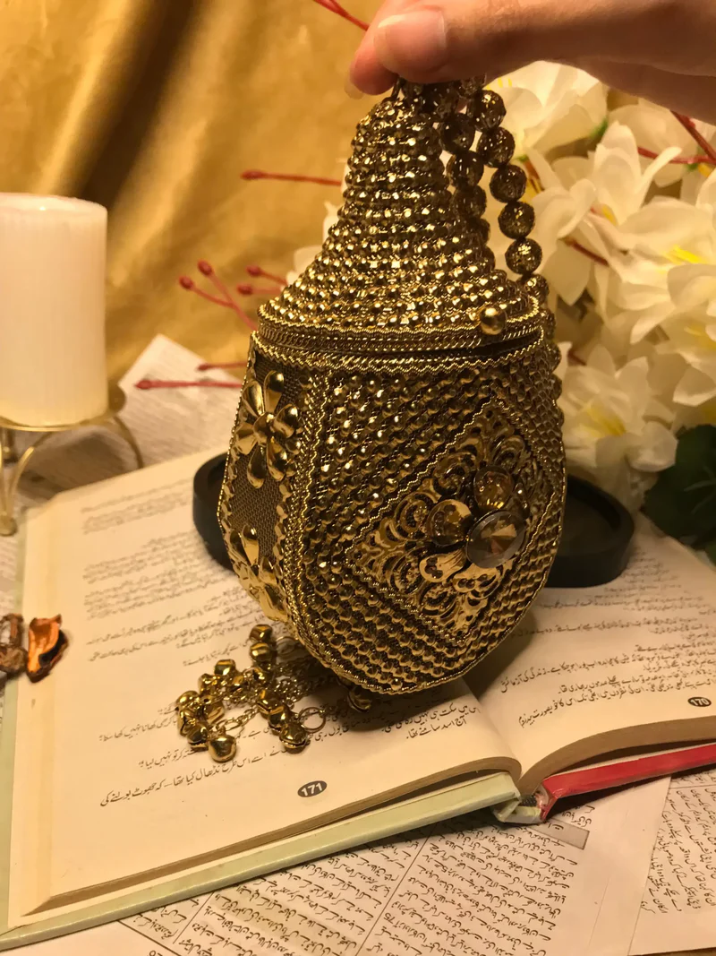 Texture Contrast: The contrast between the cold, hard gold of the clutch and the soft, paper pages of the book creates a compelling visual narrative. The Urdu text on the pages suggests a background of heritage and poetic storytelling.