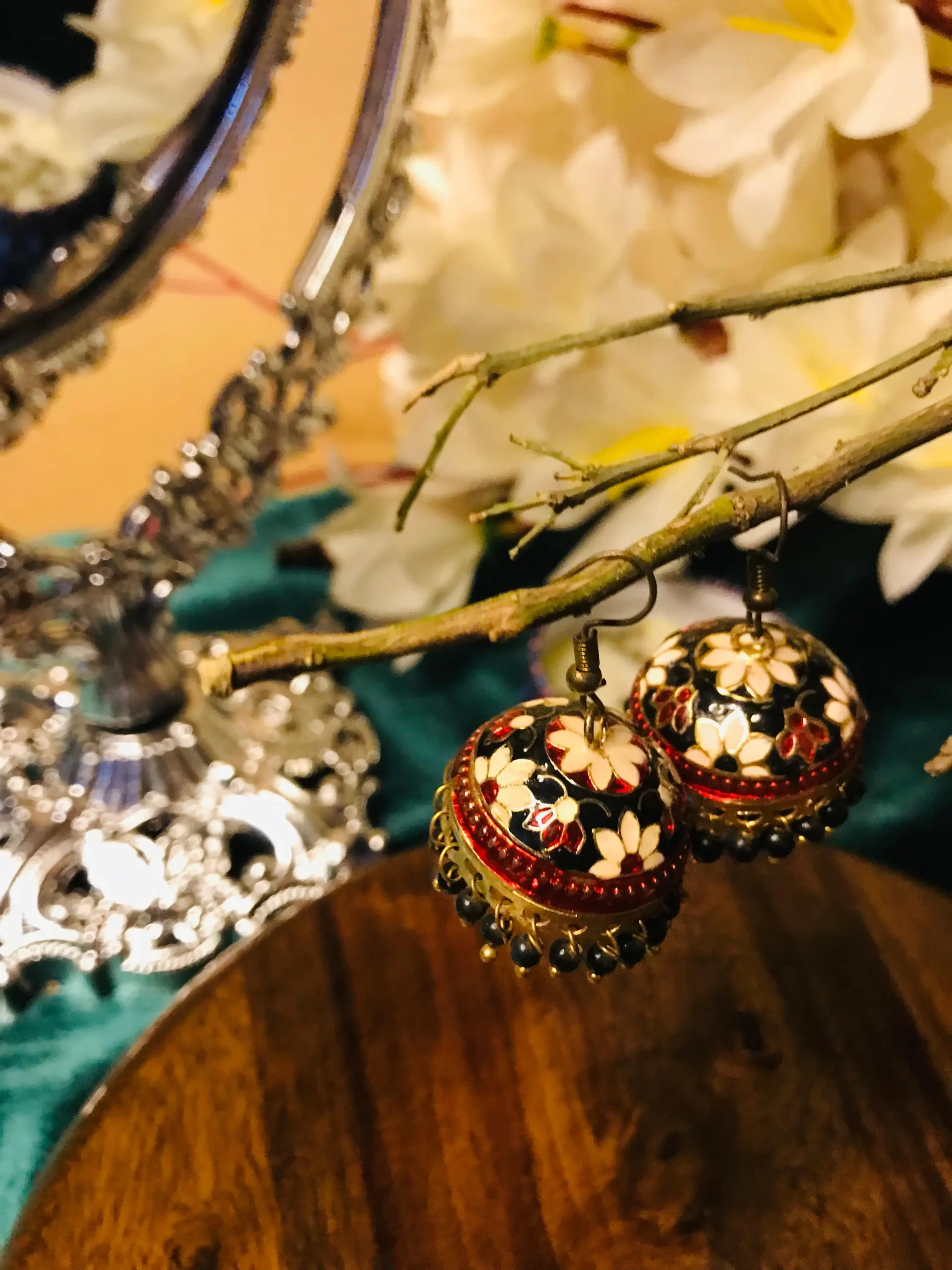 The immediate background also includes a circular wooden surface, likely a table or furnishing, whose warm tones ground the composition in an earthy, artisanal context. The wood’s natural texture complements the handcrafted nature of the earrings, reinforcing the idea of tradition and authenticity. The dried twig from which the earrings hang crosses the frame diagonally, adding a natural, organic element and creating a sense of movement and depth within the image. This diagonal line guides the viewer’s eye effortlessly toward the earrings, enhancing the overall visual flow.
