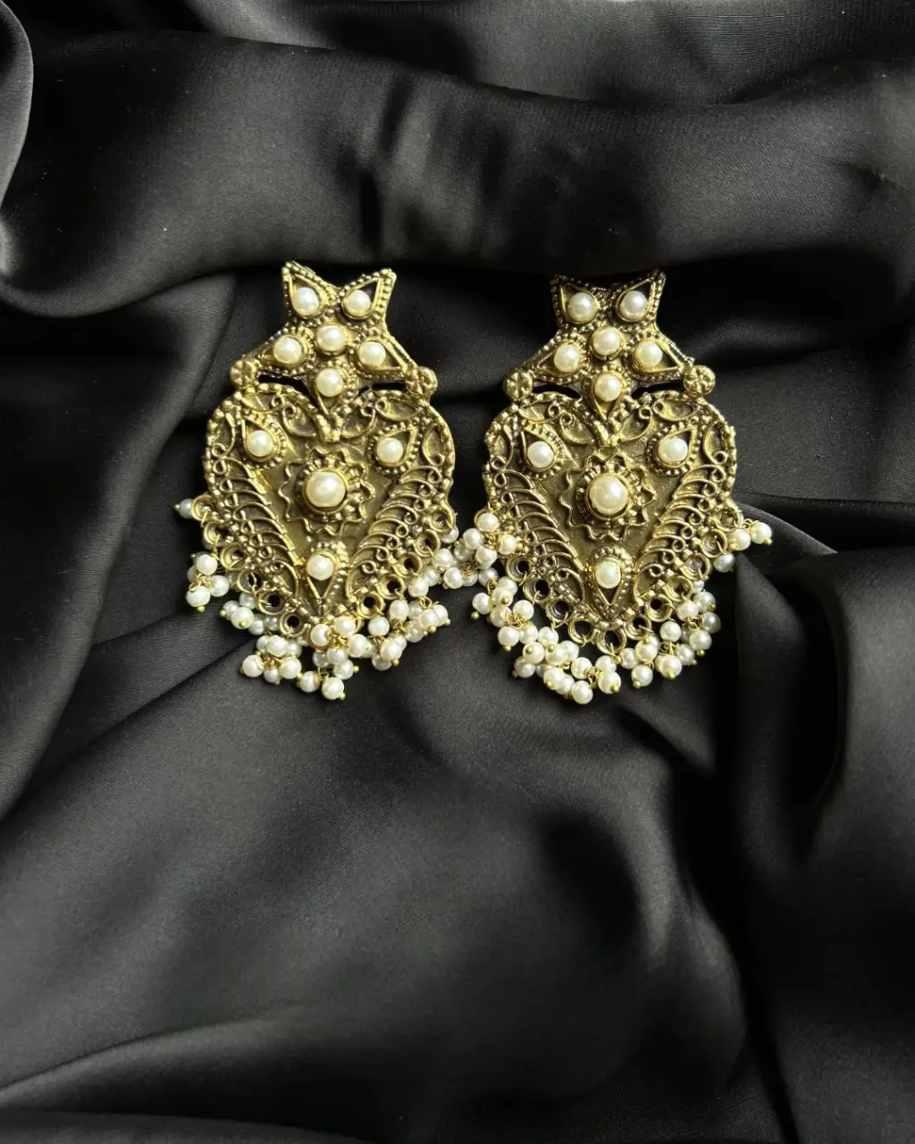 Our Oxidized Jewelry Earrings are not just a piece of jewelry; they are a statement of style. The meticulous design showcases intricate oxidized detailing that adds depth and character. The gold plating not only provides a luxurious feel but also ensures durability and long-lasting beauty. The carefully selected white pearls complement the gold perfectly, creating a harmonious balance that draws attention without overwhelming your outfit.