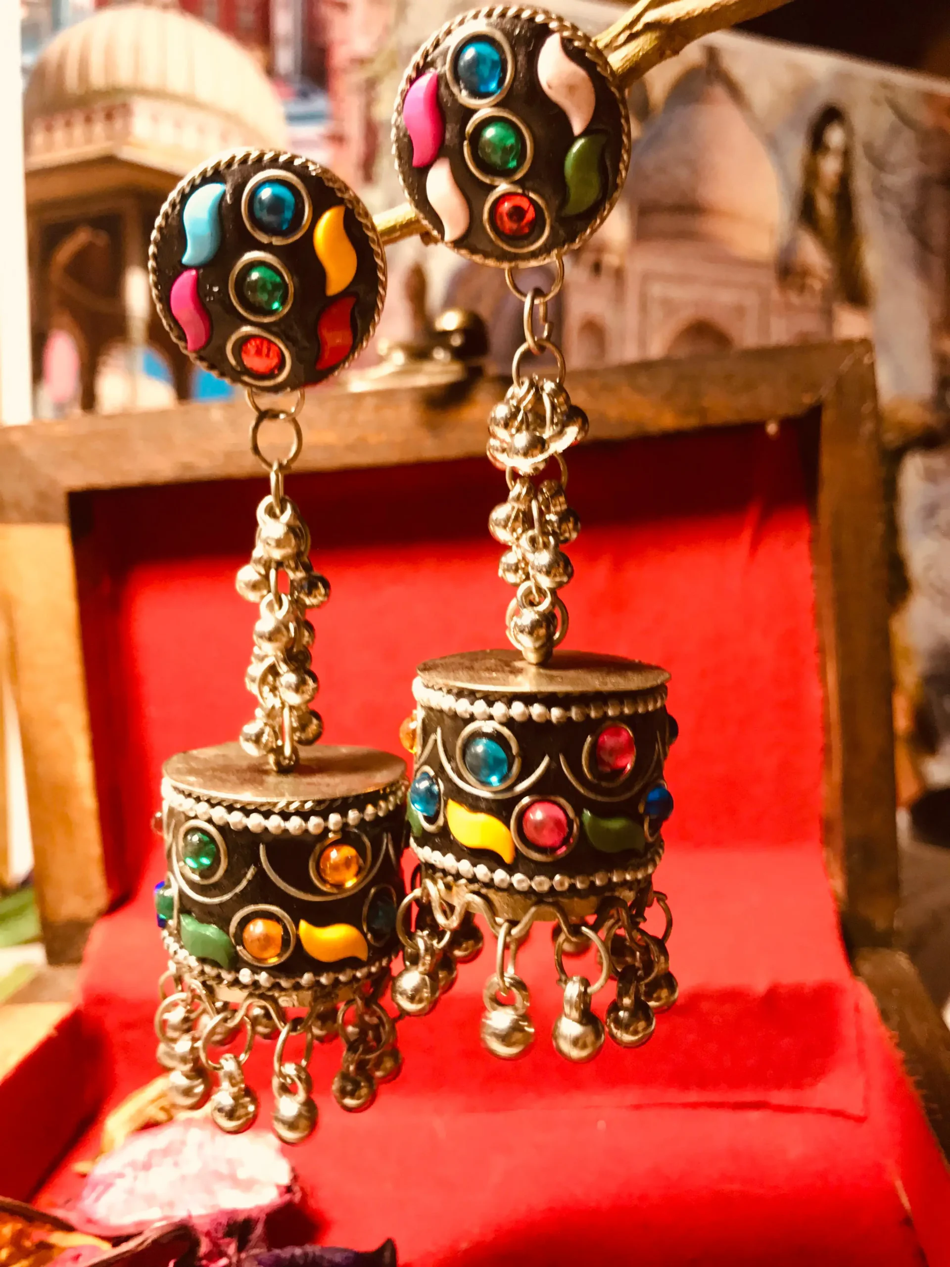 Each pair of Red Afghani Earrings is crafted from high-quality dark metals, likely brass or bronze, ensuring durability and a timeless aesthetic. The teardrop pendants prominently feature a deep red-maroon hue complemented by smaller embellishments of the same color, creating an intricate mosaic design. These earrings are not just accessories—they are wearable pieces of art that tell a story of traditional Afghani craftsmanship.