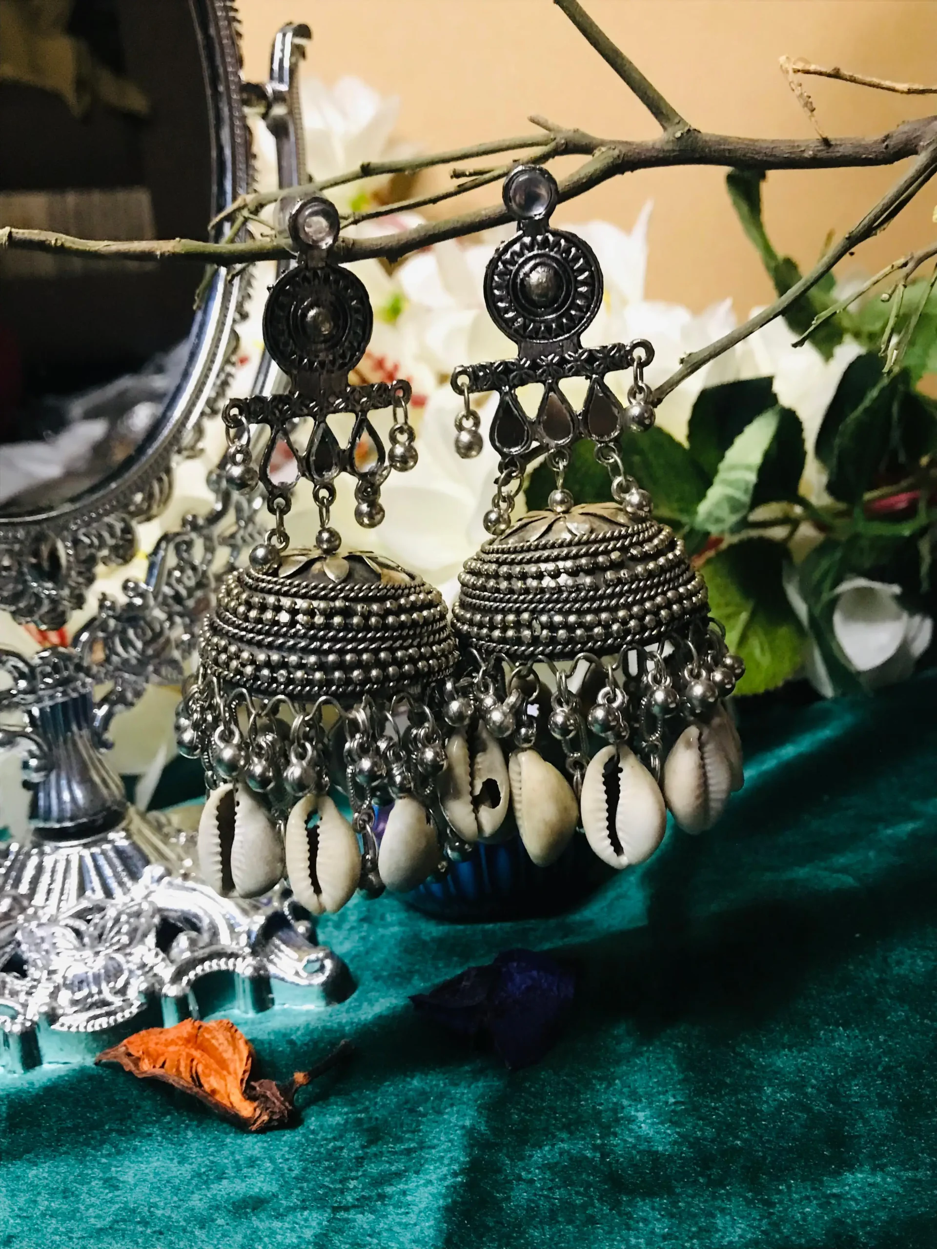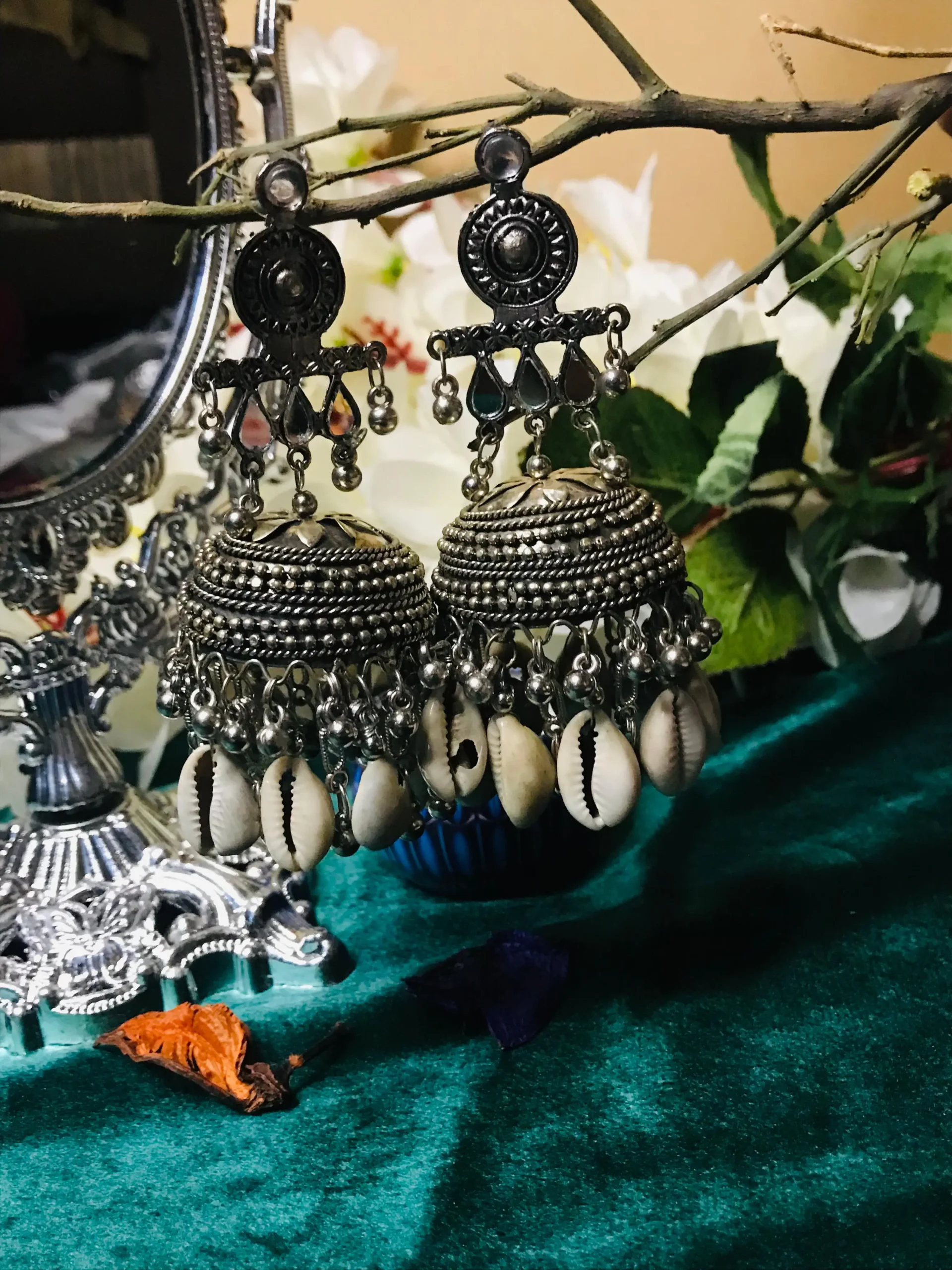To the left of the earrings, a mirror framed with silver details adds another layer of sophistication to the composition. Silver decorative elements extend outward from the mirror toward an upright metal structure that supports the earrings. This reflective surface subtly amplifies the presence of the jewelry, echoing their shine and reinforcing the luxurious feel associated with silver earrings Pakistan. The mirror also suggests themes of adornment, identity, and personal expression.