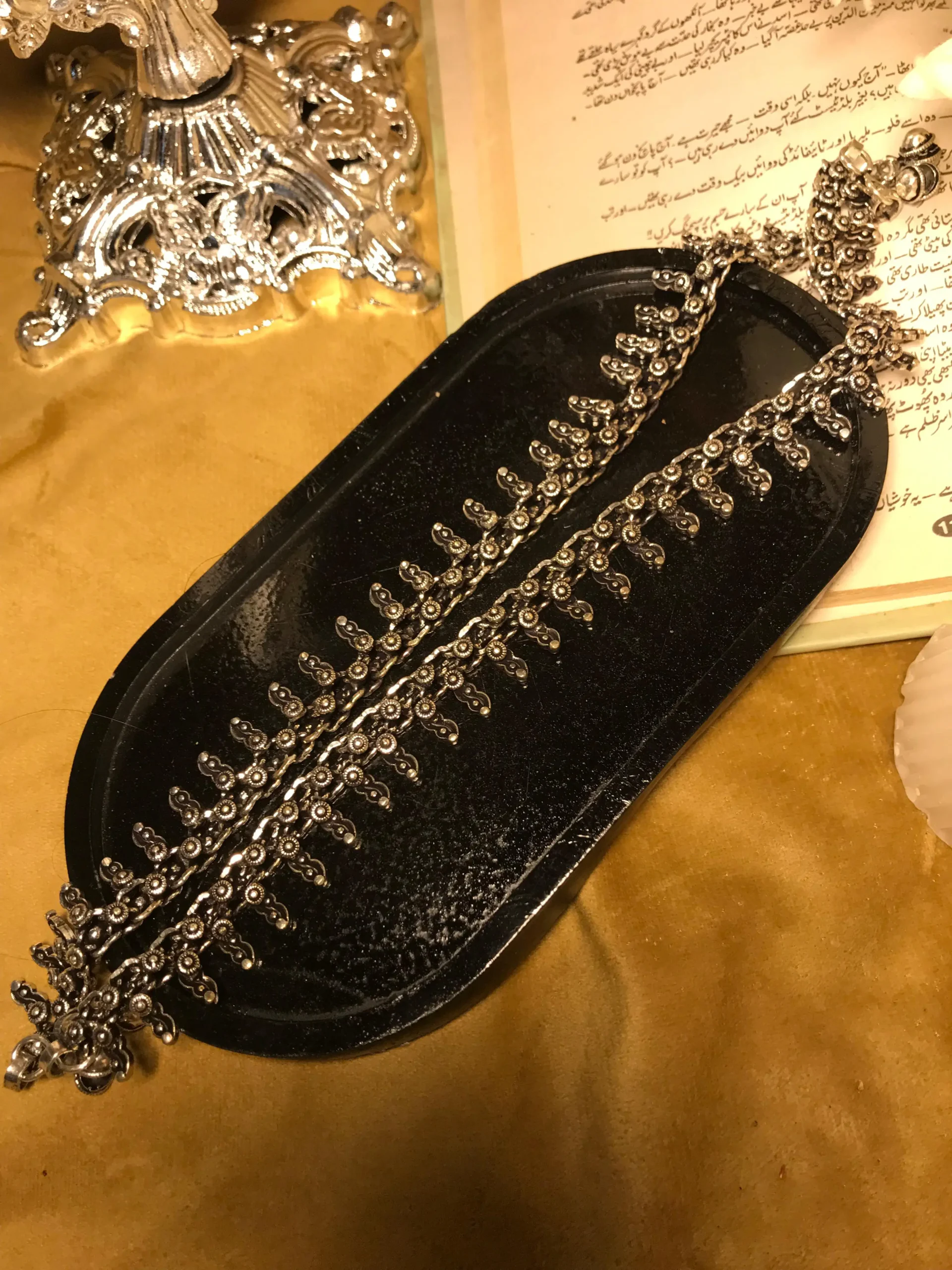 The design of the Simple Silver Pazeb Two Anklets stands out with its unique features. Each anklet is adorned with a repeating pattern of small, round beads or studs, which serve to create visual interest and texture. Complementing these beads are small leaf-shaped and teardrop-shaped embellishments, adding a hint of nature-inspired elegance. The anklets also include charming small round bells that jingle gently as you move, making them not just a piece of jewelry but also a source of pleasant sound.