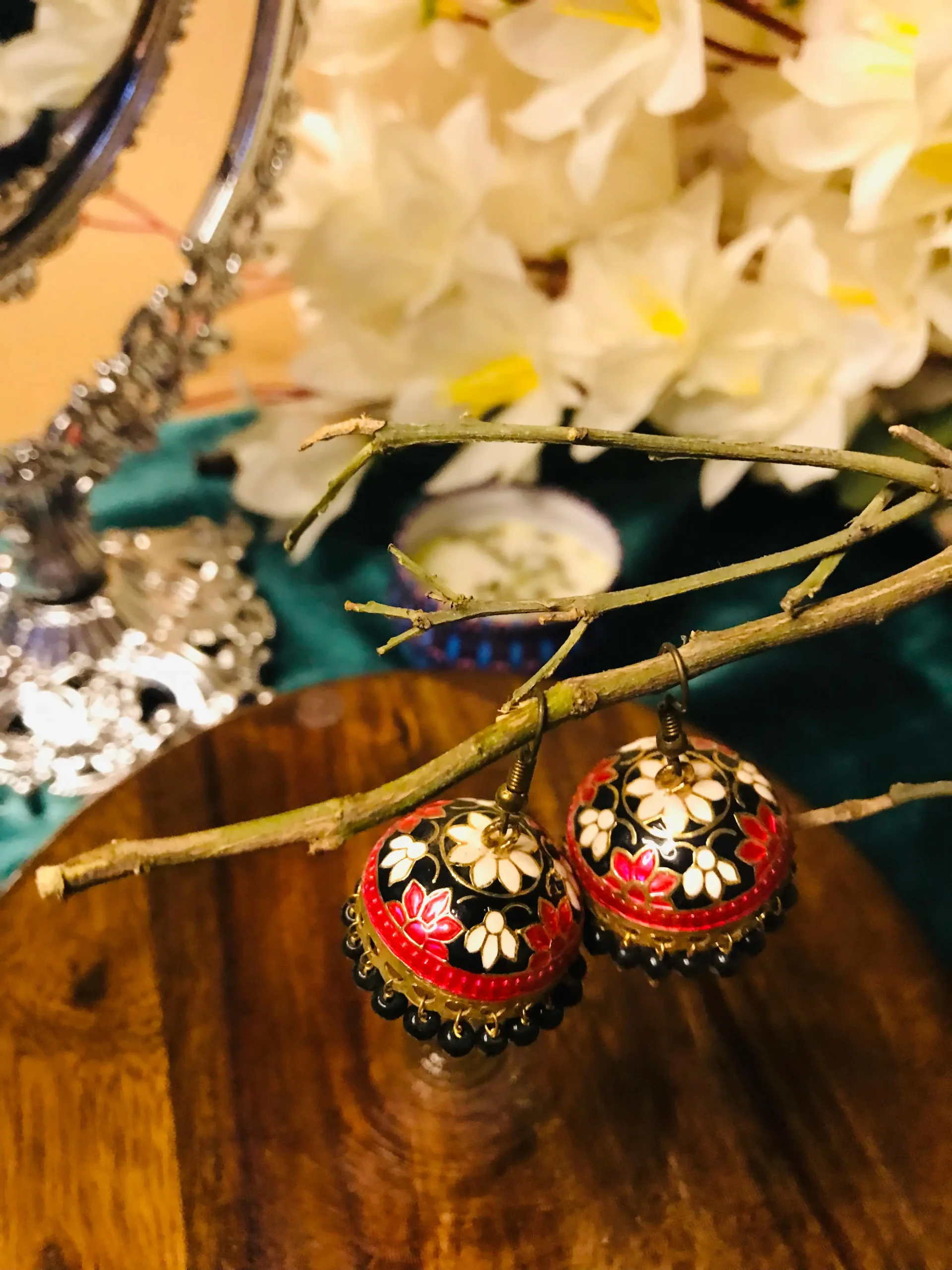Beyond the dominant gold and red tones, the earrings incorporate fine details in red, white, gold, and black. These carefully balanced accents demonstrate skilled craftsmanship and attention to detail. Black elements add contrast and definition, ensuring the design remains visually sharp rather than overly soft. This level of detail is particularly important in small jhumki earrings gold designs, where limited space demands precision to achieve richness without clutter.