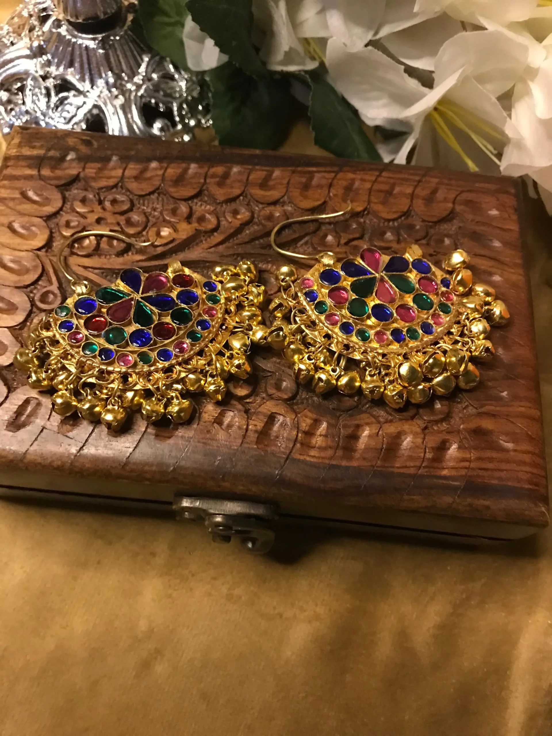 This image is a masterclass in product presentation. By placing the Traditional Gold Bali Earrings on a dark, reflective tray and surrounding them with gold silk and white lilies, the photographer has created a narrative of luxury and celebration. It is an invitation to the viewer to appreciate the intricate details of the metalwork and the joyful play of colors, making it an irresistible piece for any jewelry lover’s collection.